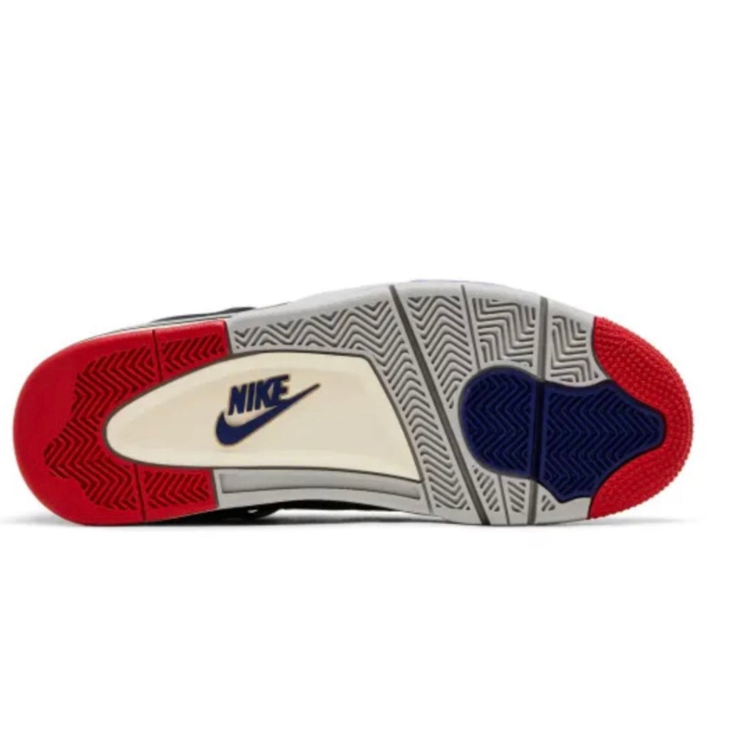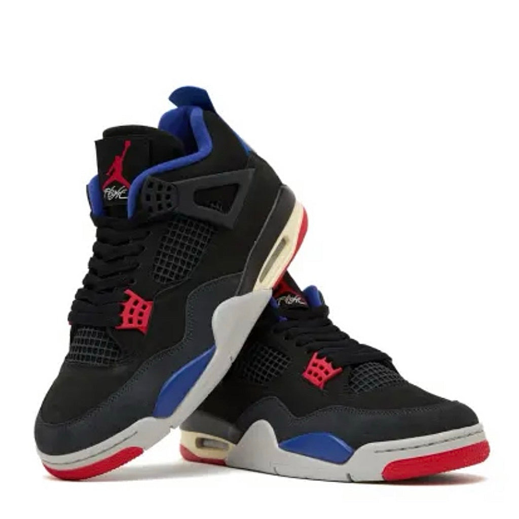 The Air Jordan 4 "Rare Air" features a dynamic colour palette of Black, Fire Red, Deep Royal Blue, Dark Smoke Grey, and Tech Grey, somewhat merging the OG "Black Cement" and "Military Blue" colorways — including the OG Nike Air branding.