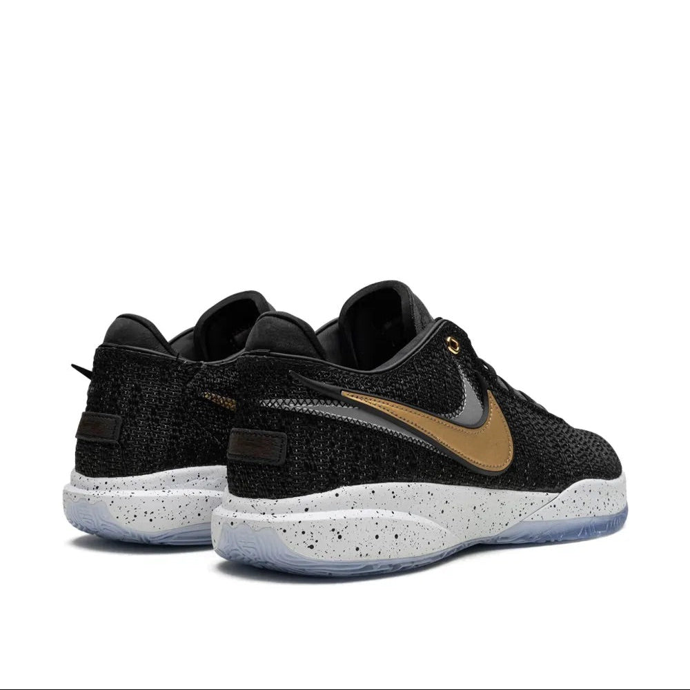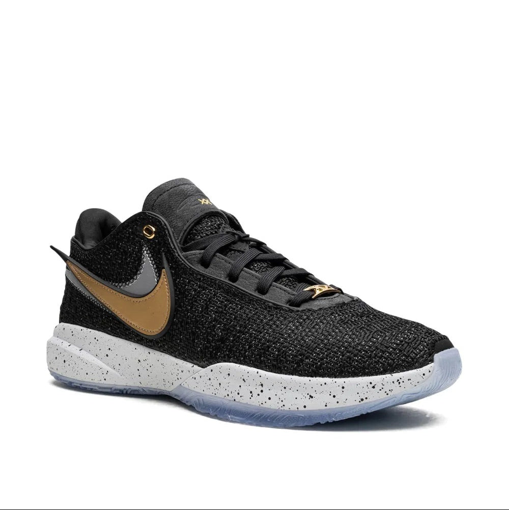 Introducing the Nike LeBron 20 in a sleek black colorway with a touch of luxury - featuring a gold-tone Swoosh logo inspired by the wings of the Goddess of Victory. With its durable rubber sole and iconic design, these sneakers are perfect for any athletic or casual occasion.