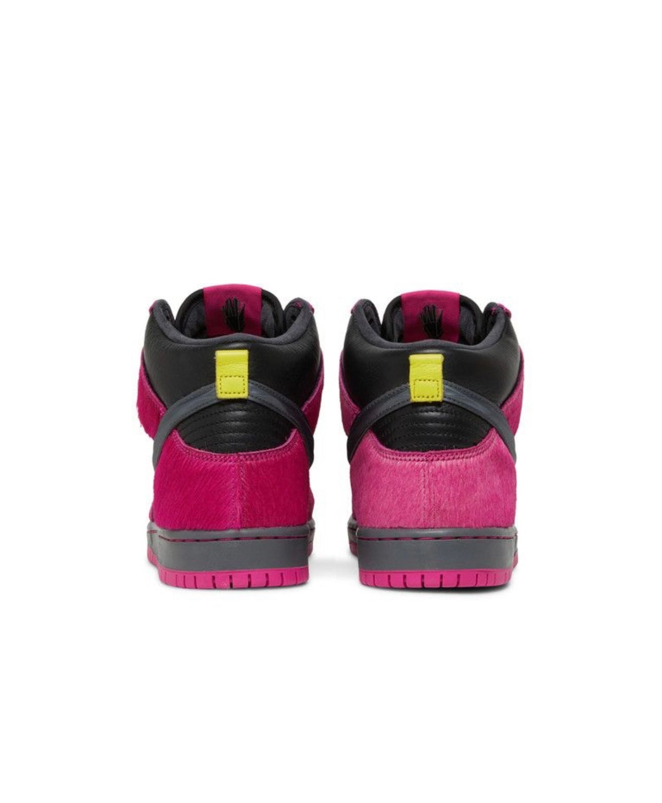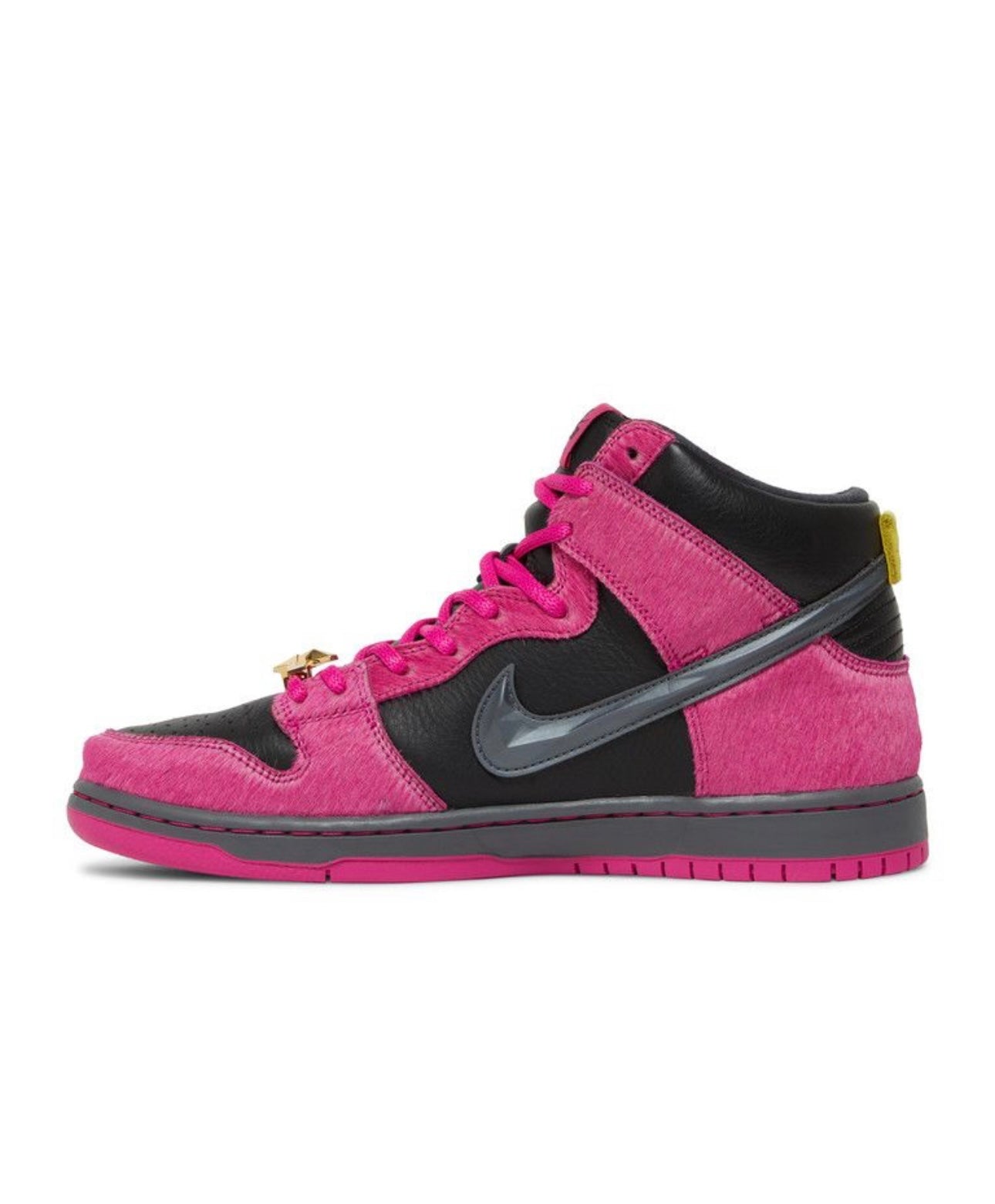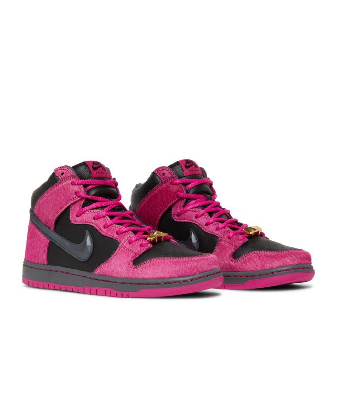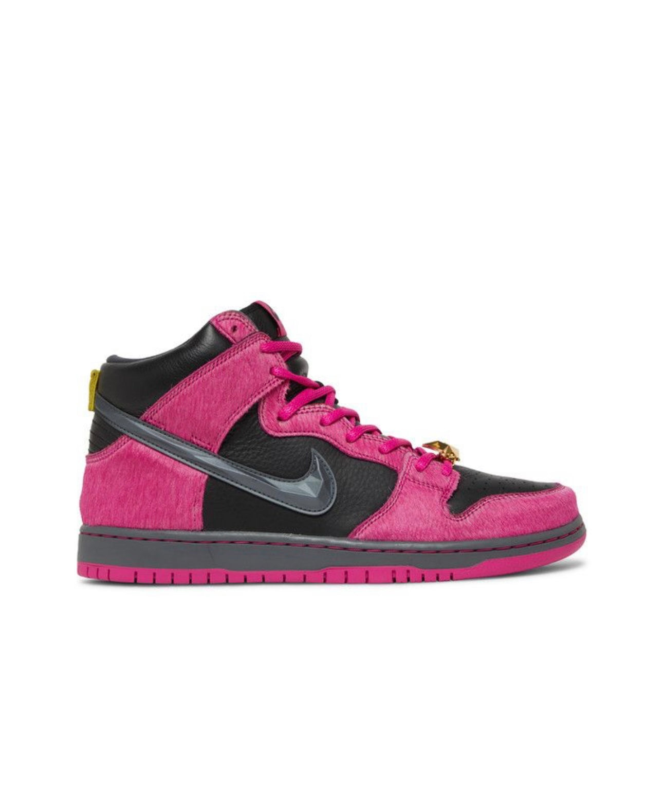 The Run The Jewels × Nike Dunk High SB '4/20' pays tribute to the influential hip-hop duo formed by El-P and Killer Mike. Their dynamic sound is reflected in the shoe's contrasting colors and textures, highlighted by a black tumbled leather upper with pony-hair overlays in a bold shade of fuchsia. The black signature Swoosh features a sculpted and polished exterior, while lace dubrae shine in metallic gold. Hidden details include a 'Run The Jewels' print inscribed on the inside of each collar flap and a stash pocket on the interior tongue. The high-top is mounted on a rubber cupsole that pairs black sidewalls with a fuchsia outsole.