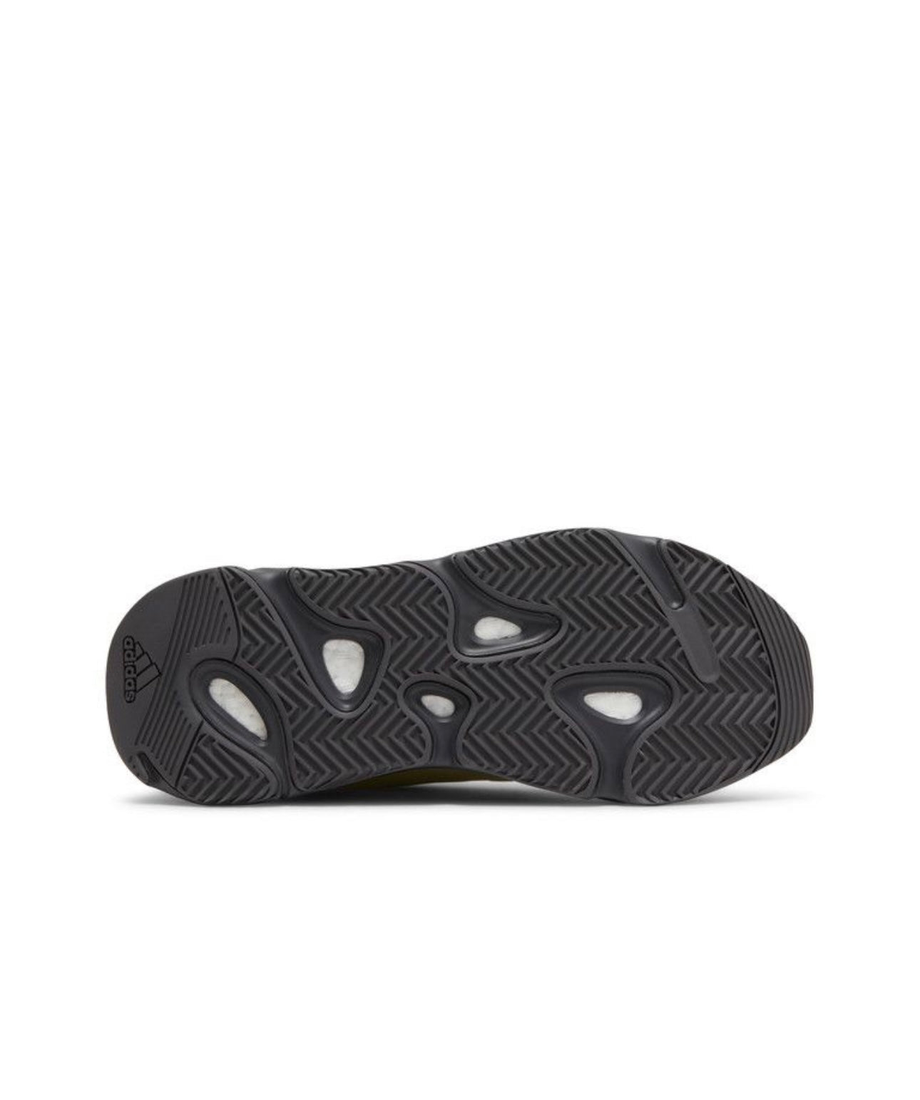 The Yeezy Boost 700 MNVN Resin features a light beige hue on the upper, crafted from a synthetic material along with reflective details. A large '700' wraps across the side of the shoe, while the sculpted midsole from the first 700 Waverunner returns in all black.